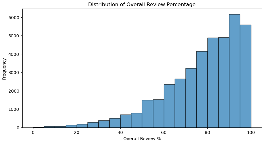 <class 'pandas.core.frame.DataFrame'> RangeIndex: 42497 entries, 0 to 42496 Data columns (total 9 columns): # Column Non-Null Count Dtype --- ------ -------------- ----- 0 title 42497 non-null object 1 genres 42410 non-null object 2 categories 42452 non-null object 3 win_support 42497 non-null bool 4 mac_support 42497 non-null bool 5 linux_support 42497 non-null bool 6 overall_review 40020 non-null object 7 overall_review_% 40020 non-null float64 8 overall_review_count 40020 non-null float64 dtypes: bool(3), float64(2), object(4) memory usage: 2.1+ MB